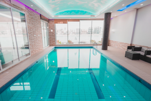 صالة كبيرة 10/11 متر مطلة على البحر وعلى حمام السباحة مع مطبخ تحضيري و حمام و حمام سباحة كبير 5.5/12 متر
